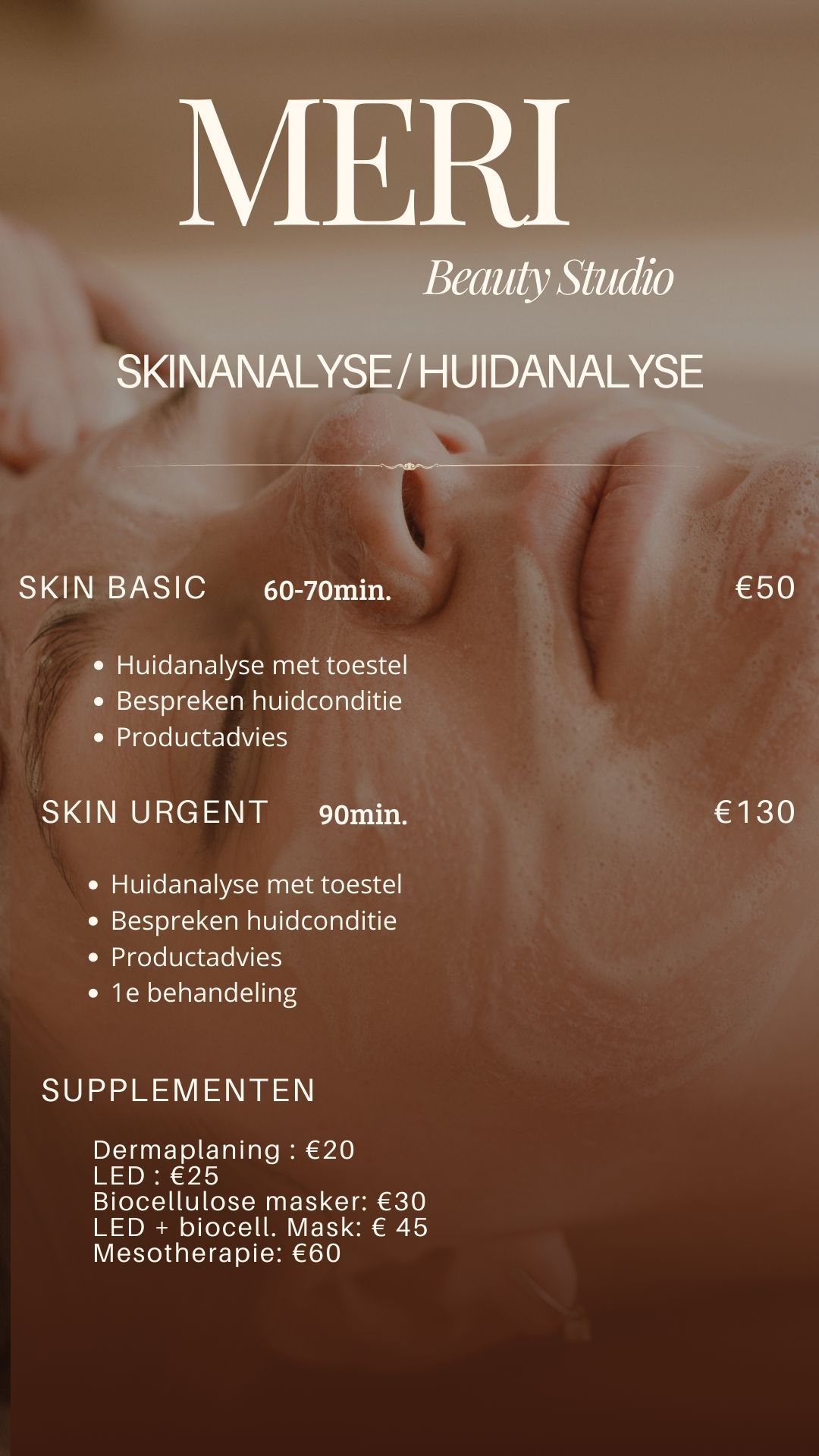 Zet de eerste stap naar een gezonde, jeugdige huid en begin met een skinanalyse gevolgd door een huidverbeterende behandeling. Elke behandeling is afgestemd op jouw huidtype en wensen. Voor wie net dat tikkeltje meer wil: ervaar de kracht van mesotherapie of onze Botoks-like Meso Combi voor een zichtbaar stevigere, gladdere huid. Ontdek wat een gepersonaliseerde behandeling voor jouw huid kan doen!